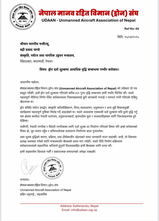 संघले बुझाएको ध्यानाकर्षण पत्रमा भनिएको छ, “ड्रोन प्रविधिले पर्यटन प्रवर्द्धन, संस्कृति अभिलेखिकरण, विपद् व्यवस्थापन, अनुसन्धान लगायतका क्षेत्रमा महत्वपूर्ण योगदान दिँदै आएको छ। तर, शुल्कमा एक्कासी गरिएको यति ठूलो वृद्धि कार्यक्षेत्रमा लागेका नेपालीहरूलाई निरुत्साहित गर्ने खालको छ।”
