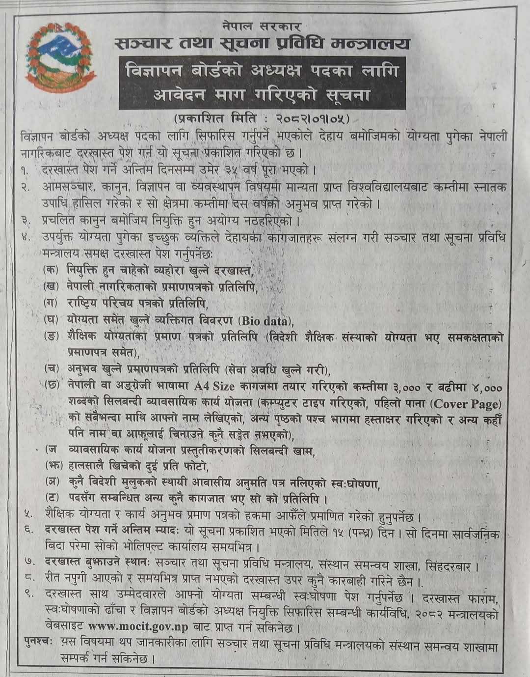 सञ्चार तथा सूचना प्रविधि मन्त्रालयले विज्ञापन बोर्डको अध्यक्ष पदका लागि आवेदन आह्वान गरेको छ । आज एक सूचना प्रकाशित गर्दै मन्त्रालयले योग्यता पुगेका नेपाली नागरिकले दरखास्त दिन सक्ने जानकारी दिएको हो ।