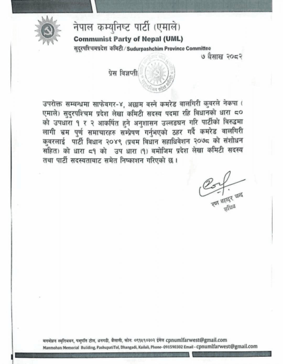 एमाले सुदूरपश्चिम सचिव रण बहादुर चन्दले एक विज्ञप्ति जारी गर्दै प्रदेश लेखा कमिटी सदस्य बालगिरी कुँवरलाई निष्कासन गरिएको जानकारी दिएका हुन् ।