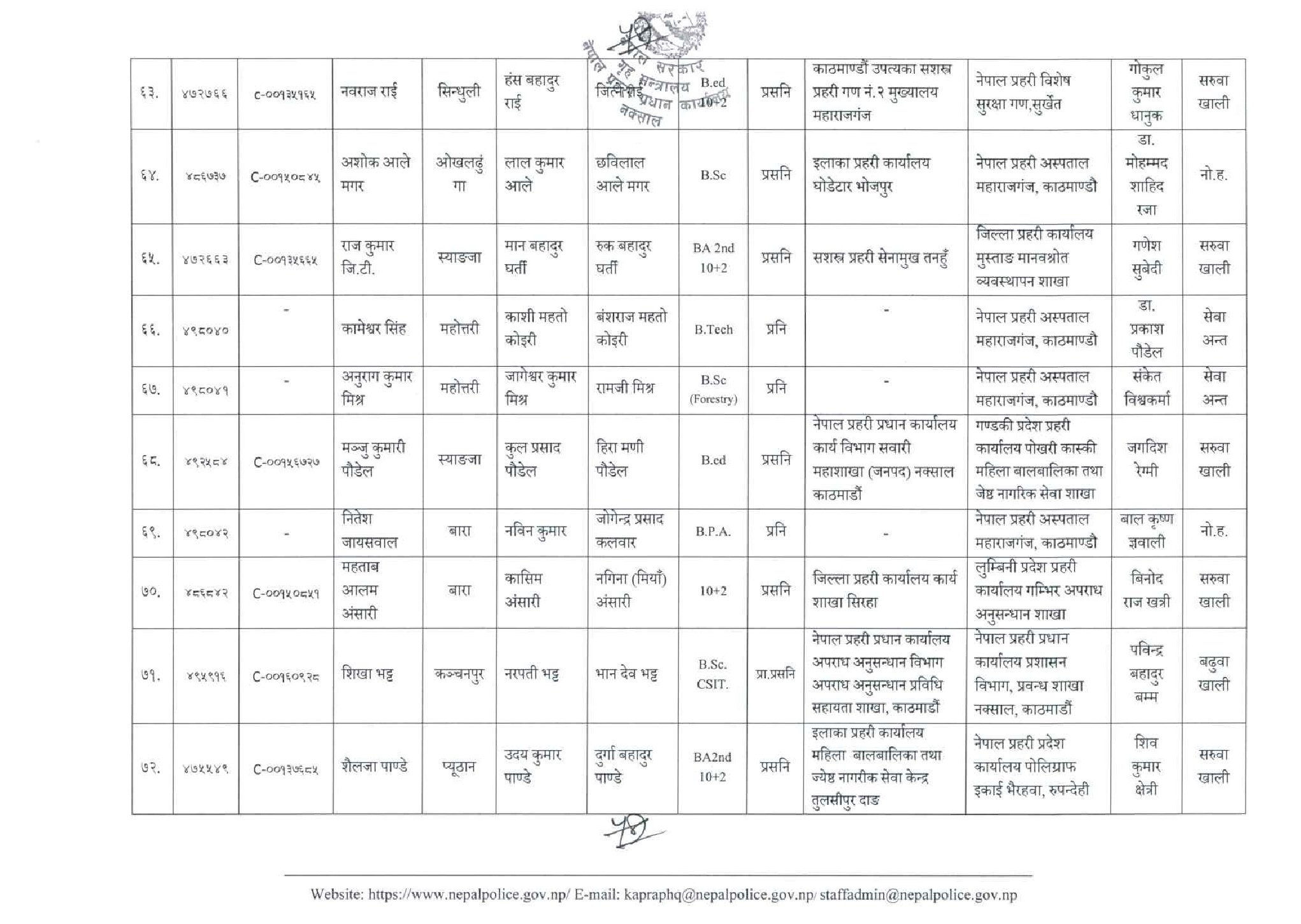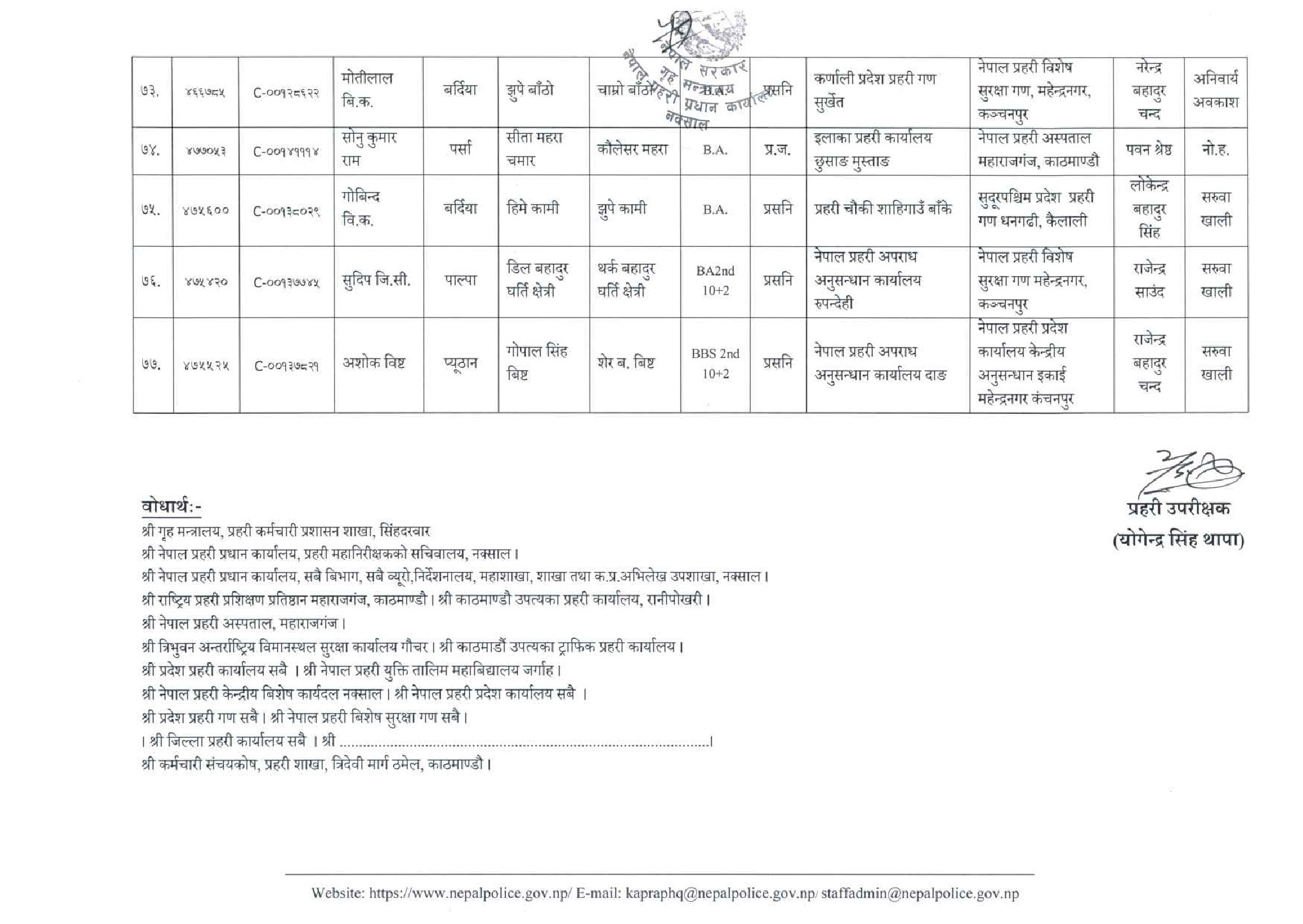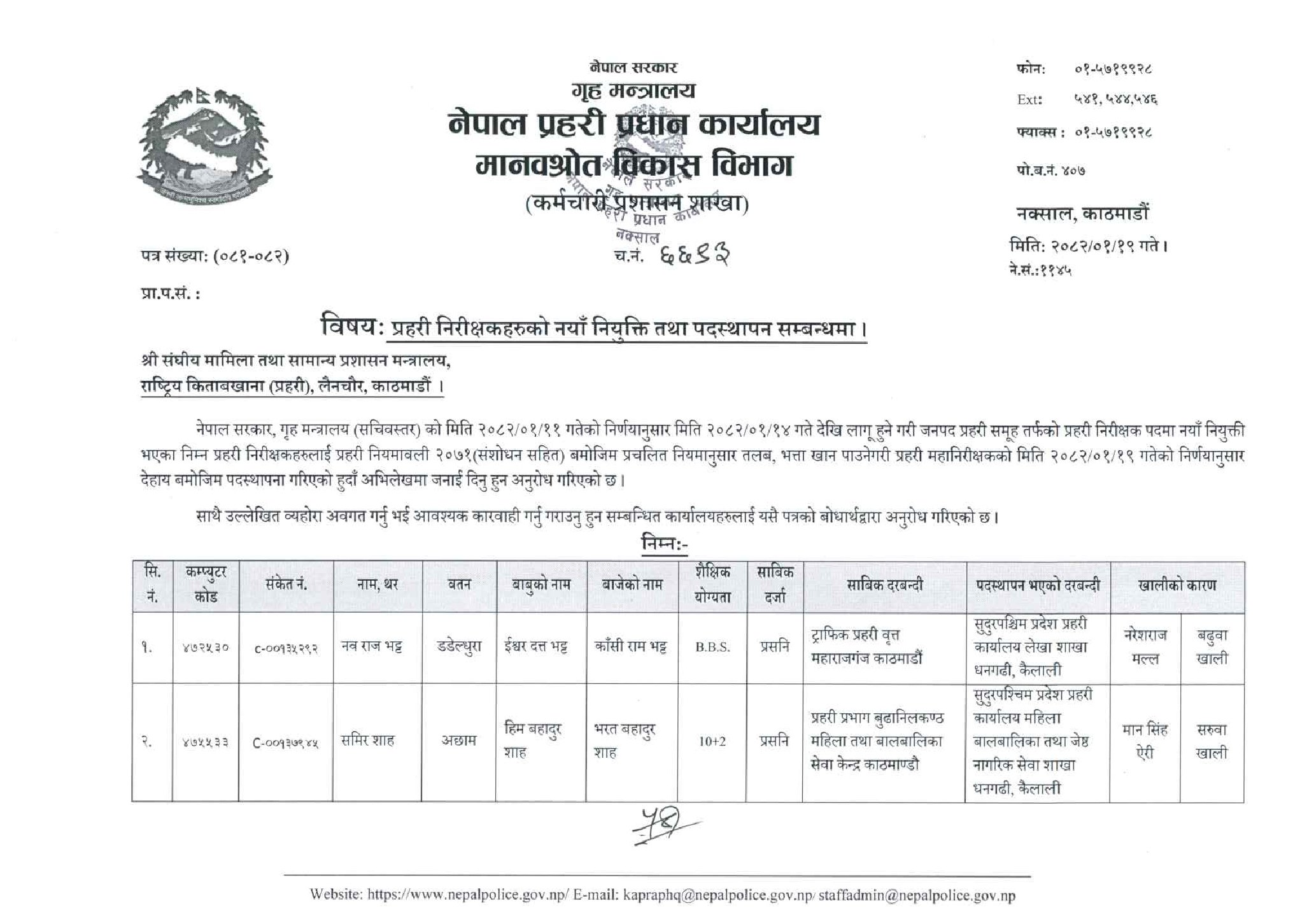 प्रहरी निरीक्षक रमेश नाथको सुदूरपश्चिम प्रदेश प्रहरी गण धनगढीमा पदस्थापन गरिएको छ । यस्तै बखत ढकालको नेपाल प्रहरी प्रदेश कार्यालय पोलिग्राफ इकाई,कञ्चनपुरमा पदस्थापन गरिएको छ । प्रहरी निरीक्षक नरेश बहादुर साउँदको कर्णाली प्रदेश प्रहरी अस्पतालमा पदस्थापन गरिएको छ ।