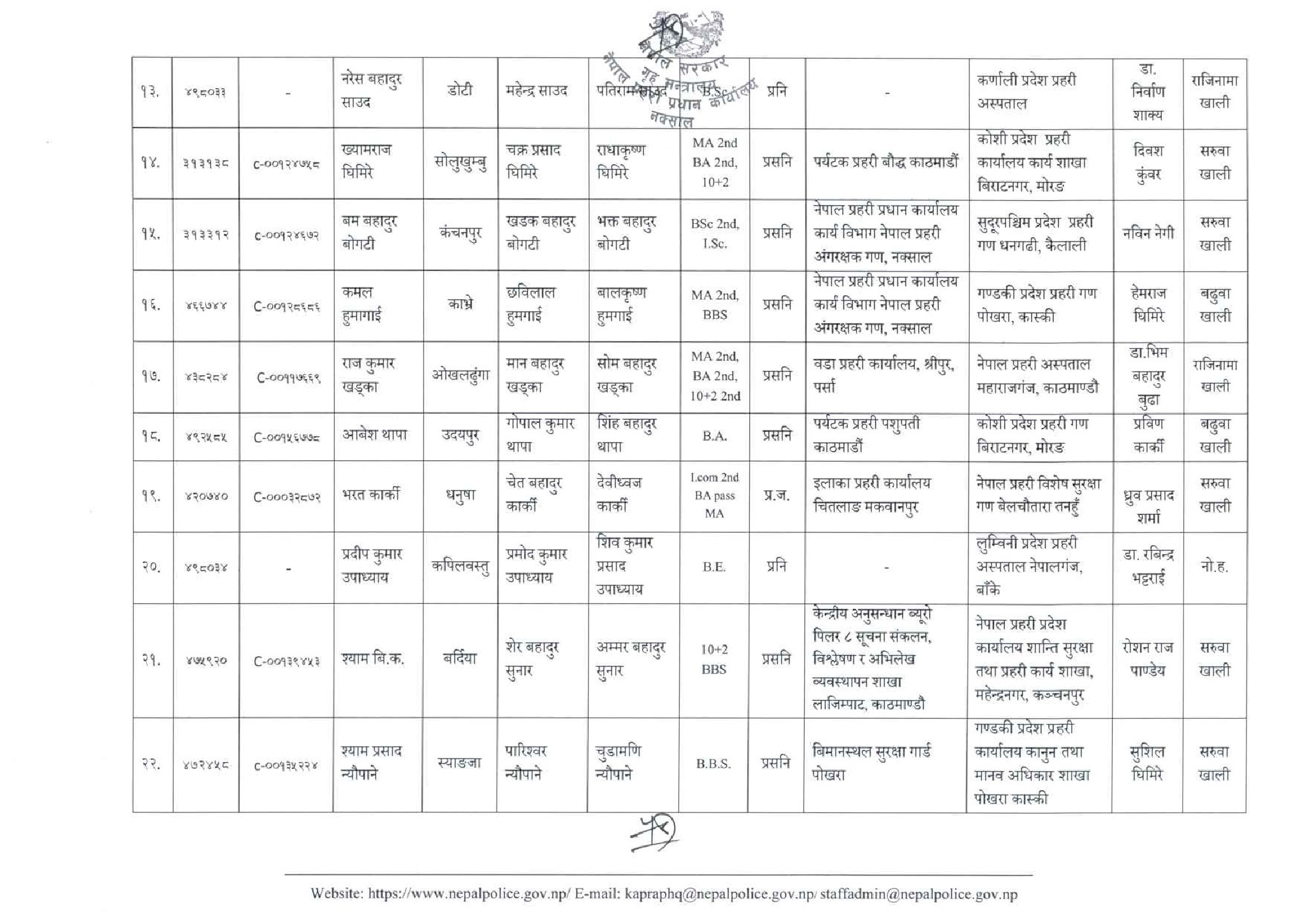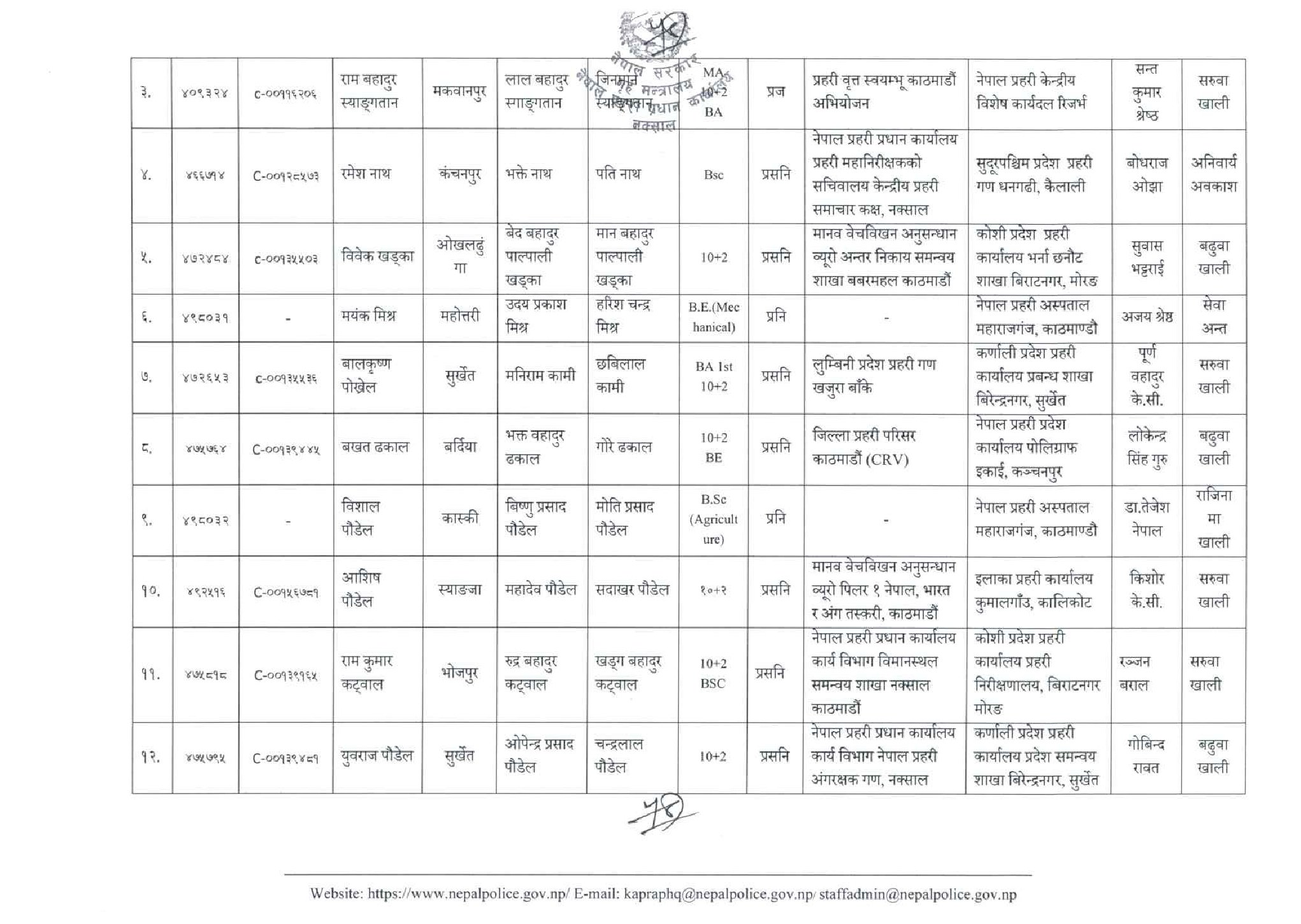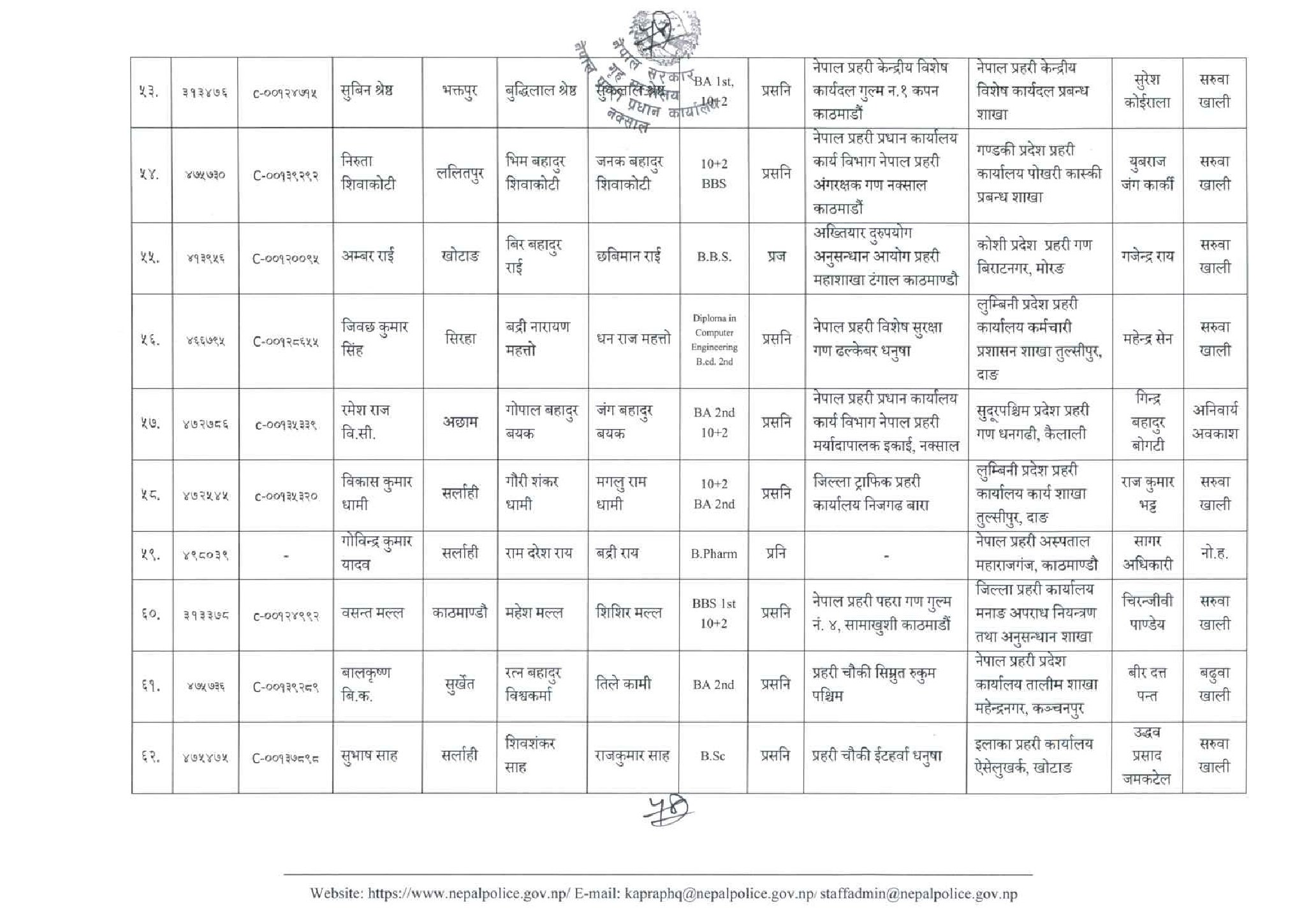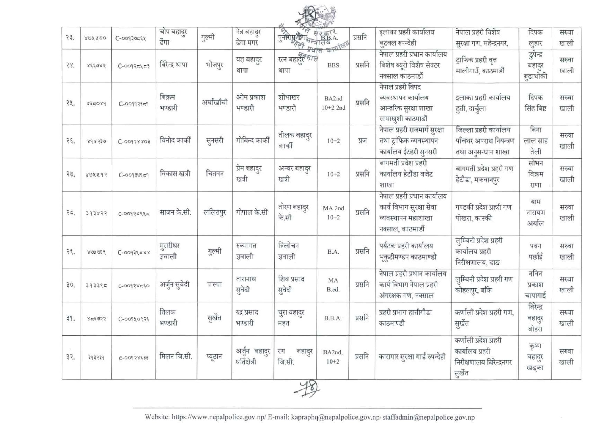 प्रहरी निरीक्षक रमेश नाथको सुदूरपश्चिम प्रदेश प्रहरी गण धनगढीमा पदस्थापन गरिएको छ । यस्तै बखत ढकालको नेपाल प्रहरी प्रदेश कार्यालय पोलिग्राफ इकाई,कञ्चनपुरमा पदस्थापन गरिएको छ । प्रहरी निरीक्षक नरेश बहादुर साउँदको कर्णाली प्रदेश प्रहरी अस्पतालमा पदस्थापन गरिएको छ ।