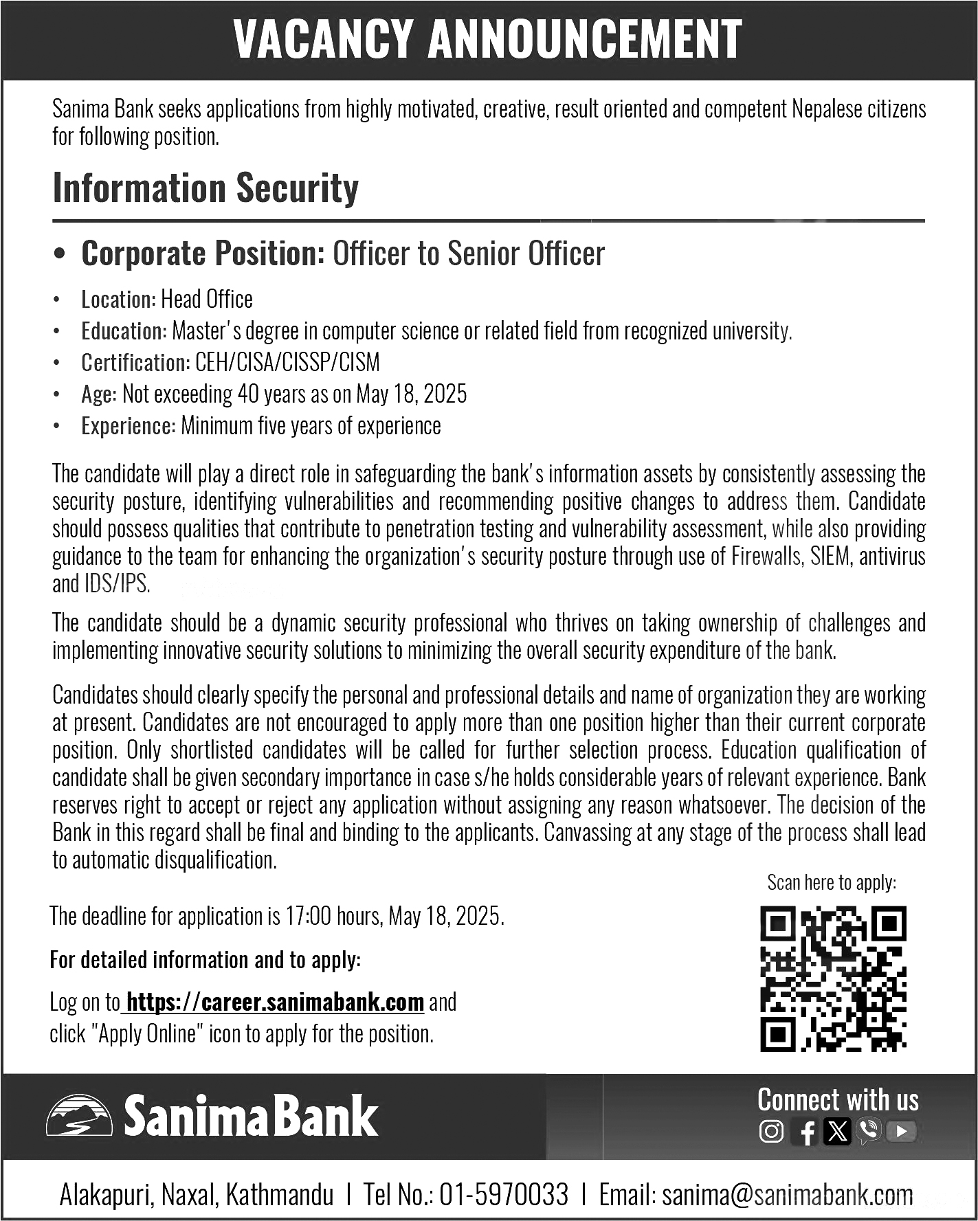 बैंकले उक्त पदको अधिकृतदेखि वरिष्ठ अधिकृत तहसम्मका लागि कर्मचारी माग गरेको हो। यसका लागि कम्प्यूटर विज्ञान वा सोसँग सम्बन्धित विषयमा मास्टर्स डिग्री गरेको हुनुपर्छ। साथै सीईएच, सिआईएसए, सिआईएसएसपी वा सिआईएसएममध्ये कुनै एक प्रमाणपत्र अनिवार्य गरिएको छ।