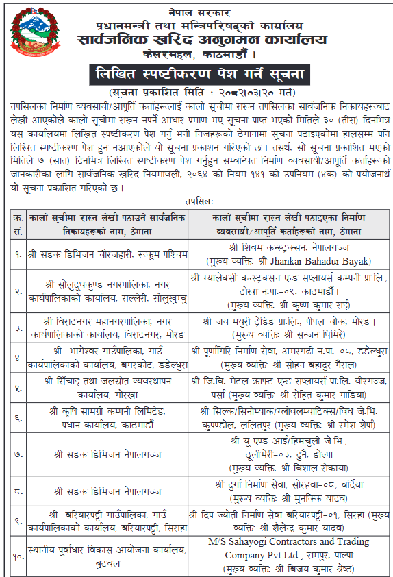 सार्वजनिक खरिद अनुगमन कार्यालयले विभिन्न १० निर्माण व्यवसायी र आपूर्तिकर्तालाई सात दिने लिखित स्पष्टीकरण सोधेको छ । कार्यालयले आज एक सूचना जारी गरी कालोसूचीमा राख्न नपर्नेको कारणसहित सात दिनभित्र लिखित स्पष्टीकरण पेश गर्न भनेको हो ।