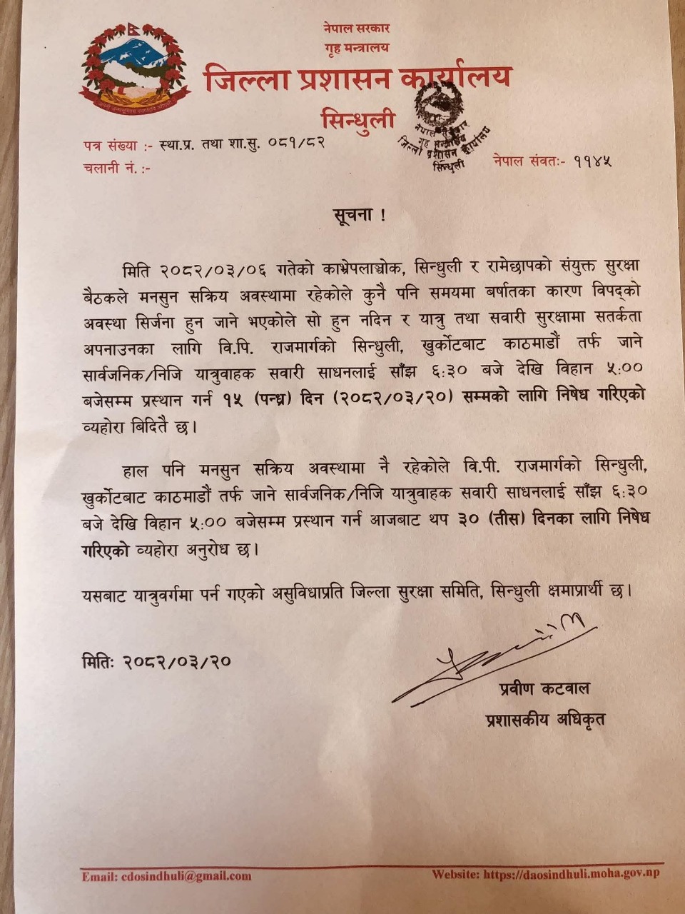 सिन्धुली र रामेछापको संयुक्त सुरक्षाका लागि गठित सुरक्षा समितिको सिफारिस अनुसार बिपी राजमार्गमा सिन्धुलीदेखि खुर्कोट हुँदै काठमाडौं जान–आउन प्रयोग हुने सार्वजनिक तथा निजी सवारी साधनको सञ्चालनमा थप ३० दिनका लागि रोक लगाइएको छ ।