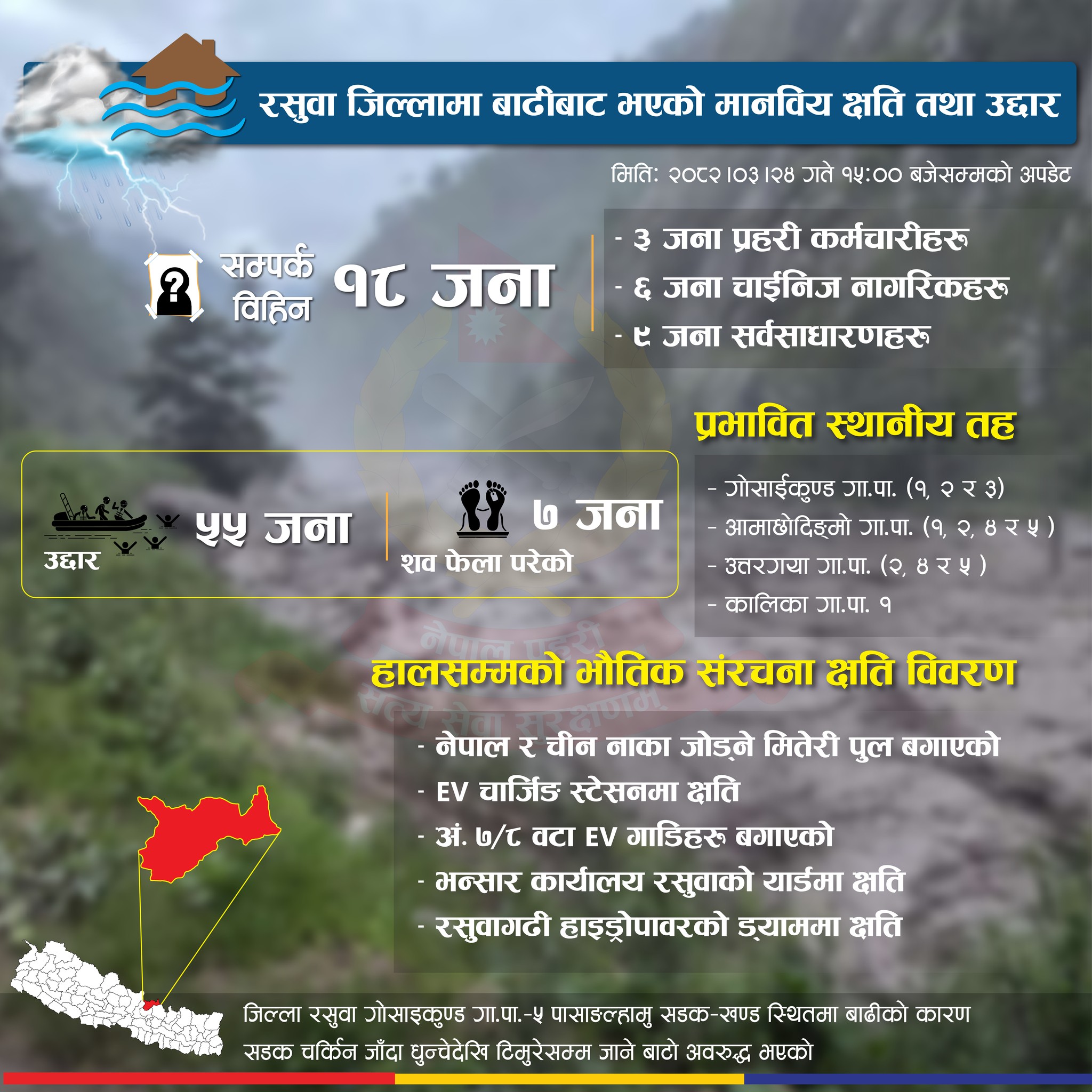 नेपाल प्रहरीले अहिलेसम्म ५५ जनाको उद्दार गरिएको र सात जना मृत फेला परेका जनाएको हो । वेपत्ता हुनेको संख्या १८ जना पुगेको प्रहरीले जनाएको छ । मंगलबार बिहान करिव ३ बजे तिब्बतमा परेको अबिरल बर्षाको कारण भारी मात्रामा बाढी आइ रसुवाको गोसाइकुण्ड गाउपालिका वडा नम्बर .२ स्थित रसुवागढीमा साढे ११ बजेसम्म तीन जना प्रहरी कर्मचारी, ६ जना चिनिया नागरिक र ९ जना सर्वसाधारण वेपत्ता रहेको नेपाल प्रहरीले जनाएको हो ।