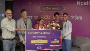“सधैं अन करोडपति अभियानअन्तर्गत यो बम्पर पुरस्कार प्रदान गर्दै हाम्रो प्रतिबद्धता पूरा गर्न पाउँदा हामीलाई अत्यन्तै खुसी लागेको छ,” एनसेलका चिफ फाइनान्सियल अफिसर इनामुल कबिरले भने । “सम्पूर्ण एनसेल परिवारको तर्फबाट म पार्वती कार्कीलाई हार्दिक बधाई दिन चाहन्छु । उहाँको कथा आशाको कथा हो । यसले हाम्रो वचनप्रति रहेको अटल प्रतिबद्धतालाई पनि प्रतिबिम्बित गर्दछ । उहाँको यात्रामा भागिदार हुन पाउँदा हामी हर्षित छौं । उहाँले यो पुरस्कार रकमलाई आफ्नै व्यवसाय सुरु गर्ने सपना साकार पार्न प्रयोग गर्नुहुनेछ भन्नेमा म विश्वस्त छु । उहाँको श्रीमान् फर्किएपछि हामी धादिङ जाने योजनामा छौं।”