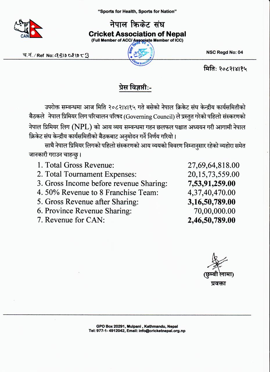यस्तै एनपिएलमा २० करोड १५ लाख ७३ हजार ५ सय ५९ रुपैयाँ खर्च भएको जनाएको छ। खर्च भएको शीर्षकहरुको विवरण पनि क्यानले खुलाएको छैन। कर बाहेक पहिलो संस्करणमा ७ करोड ५३ लाख ९१ लाख नाफा भएको क्यानको भनाइ छ। फ्रेन्चाइज टोलीलाई नाफाको ५० प्रतिशत अर्थात् ३ करोड १६ लाख बाँडिएको छ । प्रदेश संघहरुलाई ७० लाख रुपैयाँ र क्यानलाई २ करोड ४६ लाख नाफा बाँडिएको हिसाबमा उल्लेख छ। बिहीबारको केन्द्रीय कार्यसमितिका लागि १२ वटा एजेन्डा भए पनि मुख्य गरी एनपिएलको हिसाबमा छलफल भएको थियो।