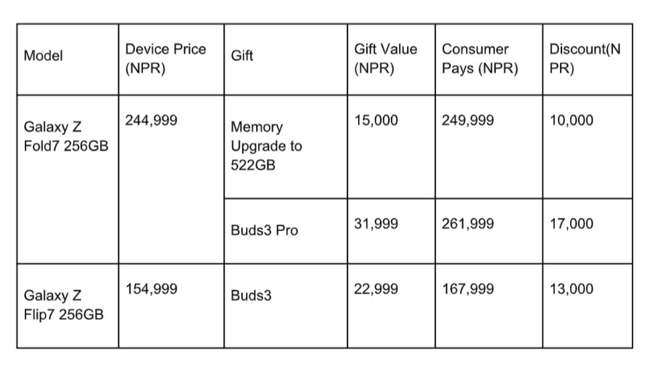 ग्यालेक्सी जेड फोल्ड७ र ग्यालेक्सी जेड फ्लिप७ को २५६जीबी भेरियन्टहरू नेपालमा साउन २२ देखि २९, २०८२ सम्म प्रि–अर्डरका लागि उपलब्ध हुसनेछन्।