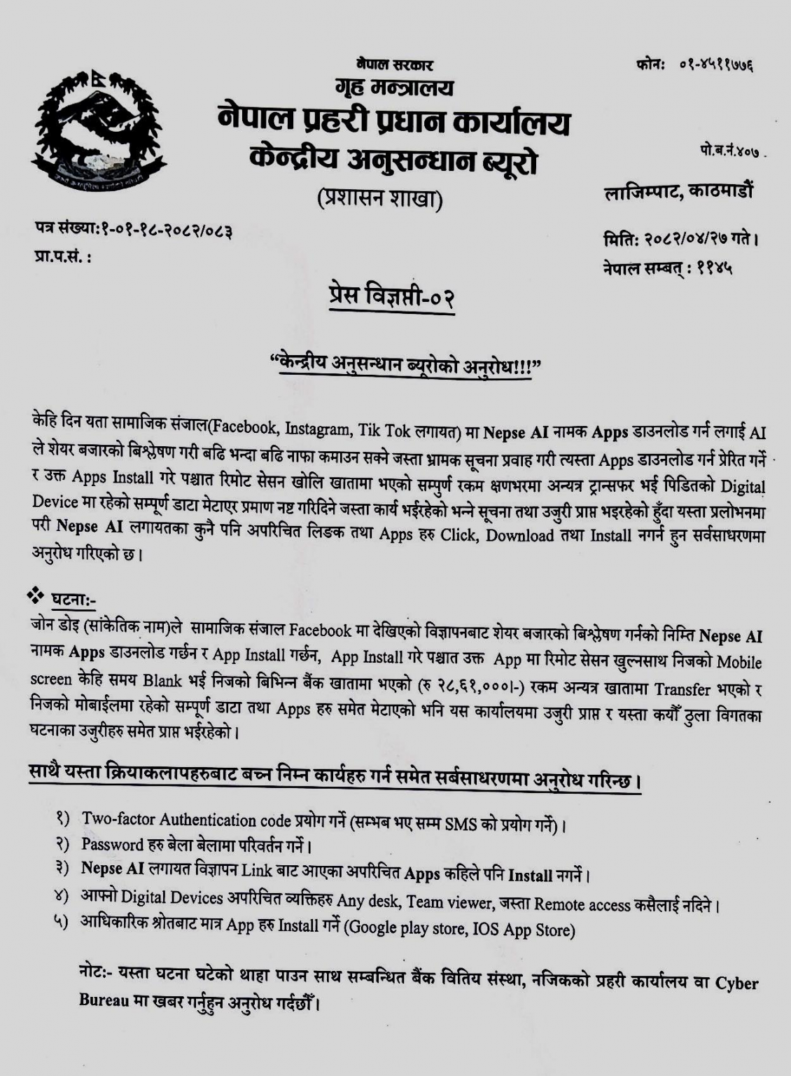 नेपाल प्रहरीको केन्द्रीय अनुसन्धान ब्युरो (सीआईबी) ले नेप्से एआई एपबाट नामक एपमार्फत ठगी बढ्न थालेपछि सर्वसाधारणलाई सचेत रहन आग्रह गरेको छ ।