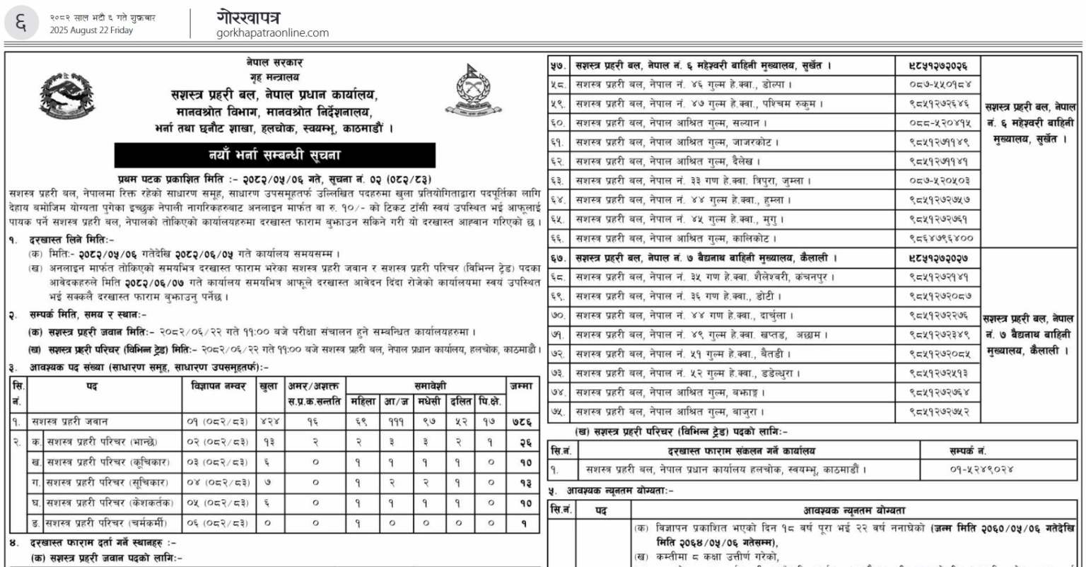 सशस्त्र प्रहरी बल मानवस्रोत विभागले आज एक सूचना जारी गर्दै ठूलो संख्यामा जवान, भान्से, कुचिकार, सूचीकार, केशकर्तक र चर्मकर्मी पदका लागि दरखास्त आह्वान गरेको हो ।