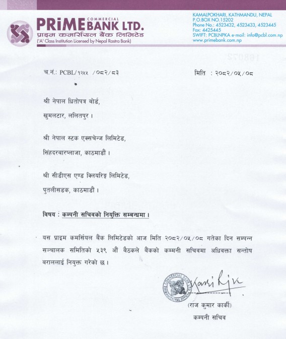 प्राइम कमर्सियल बैंक लिमिटेडको कम्पनी सचिवमा अधिवक्ता सन्तोष बराल नियुक्त भएका छन् ।