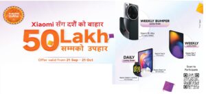 शाओमी नेपालले दसैँको अवसरमा दैनिक र साप्ताहिक रूपमा ‘लक्की ड्र’ मार्फत आकर्षक उपहारहरू प्रदान गर्ने योजना ल्याएको हो। कम्पनीका अनुसार, यो स्किम शाओमीका कुनै पनि मोबाइल खरिद गर्ने ग्राहकलाई लक्षित गरिएको छ।