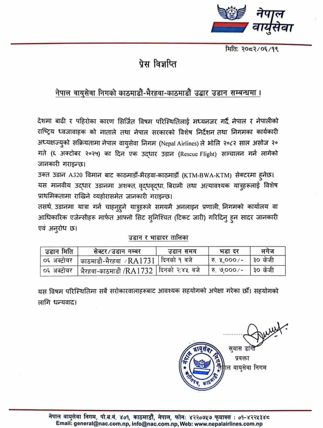 निगमका प्रवक्ता सुवास डाँगीका अनुसार दिउँसो १ बजे काठमाडौंबाट भैरहवा उडान हुनेछ भने अपराह्न २:४५ बजे भैरहवाबाट काठमाडौंका लागि फर्किने छ। काठमाडौं–भैरहवा उडानको भाडादर पाँच हजार र फर्किने टिकटको भाडा सात हजार रुपैयाँ तोकिएको छ।
