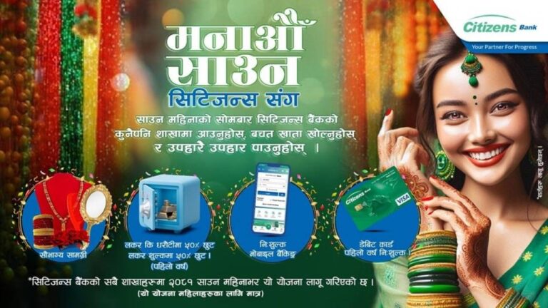 सिटिजन्स बैंकको ‘मनाऔं साउन सिटिजन्स’सँग अफर सार्वजनिक, के-के छन् सुविधा? २०८२ श्रावण ४ आईतवार • बिजनेस न्यूज नेपाल