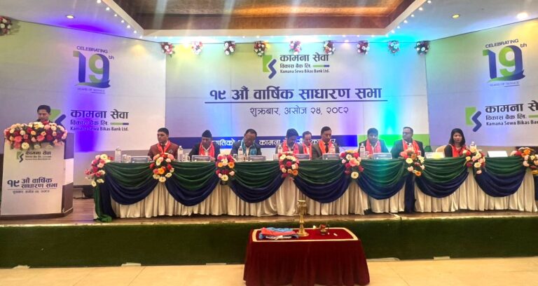 कामना सेवा विकास बैंकको १९औं वार्षिक साधारणसभा सम्पन्न, १५.७८ प्रतिशत लाभांश पारित २०८२ आश्विन २४ शुक्रबार • -बिजनेश न्यूज नेपाल