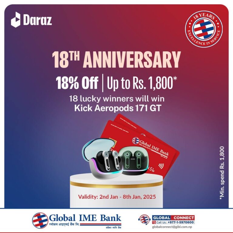 ग्लोबल आइएमई बैंकको १८औँ वार्षिकोत्सवको अवसरमा बैंकका ग्राहकहरूलाई दराजमा १८ प्रतिशत छुट २०८१ पुष १७ बुधबार • बिजनेस न्यूज नेपाल